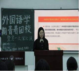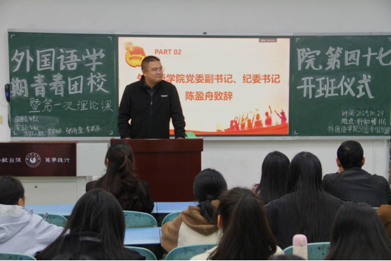 本网讯(文/牟春梅、陶爽 图/宋宗恒)为切实加强团员青年的思想政治引领,夯实基层团组织建设,10月23日下午,外国语学院第四十七期“青春团校”开班仪式在行知楼116教室举行。外国语学院党委副书记、纪委书记陈盈舟,学生办公室副主任、分团委书记曹琳老师,2023级辅导员王旺兵老师,2024级辅导员陶爽老师以及46名同学共同参加。本次团课由马克思主义学院乐师红帆宣讲团成员胡芯宁同学主讲。