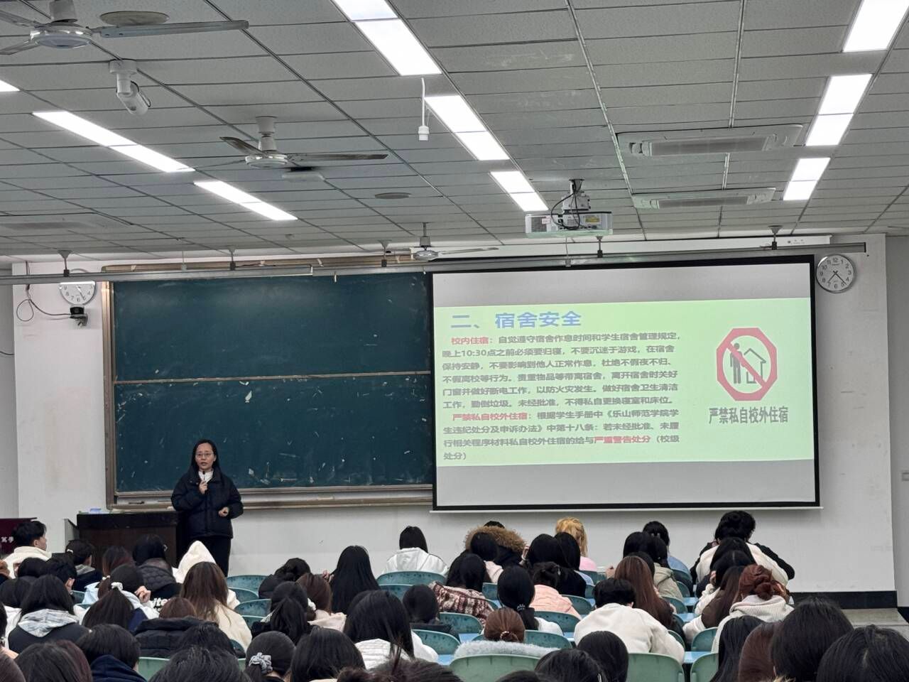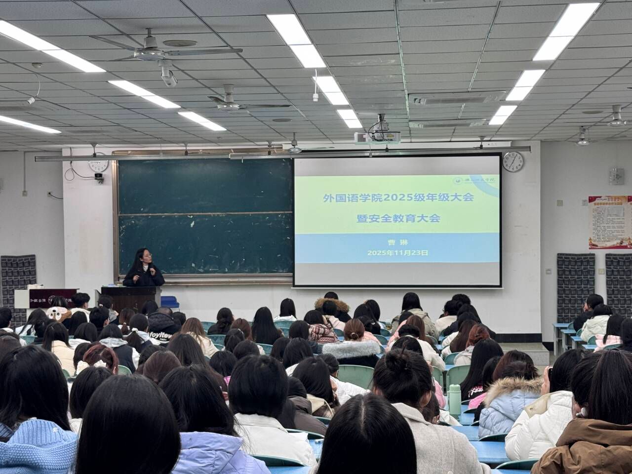 本网讯(文、图/曹琳、邱贝玲)为增强学生安全意识,规范日常行为,促进学业发展,11月23日,外国语学院在行知楼225教室组织召开了2025级年级大会暨安全教育大会。会议由辅导员曹琳主讲,全体2025级学生参加。