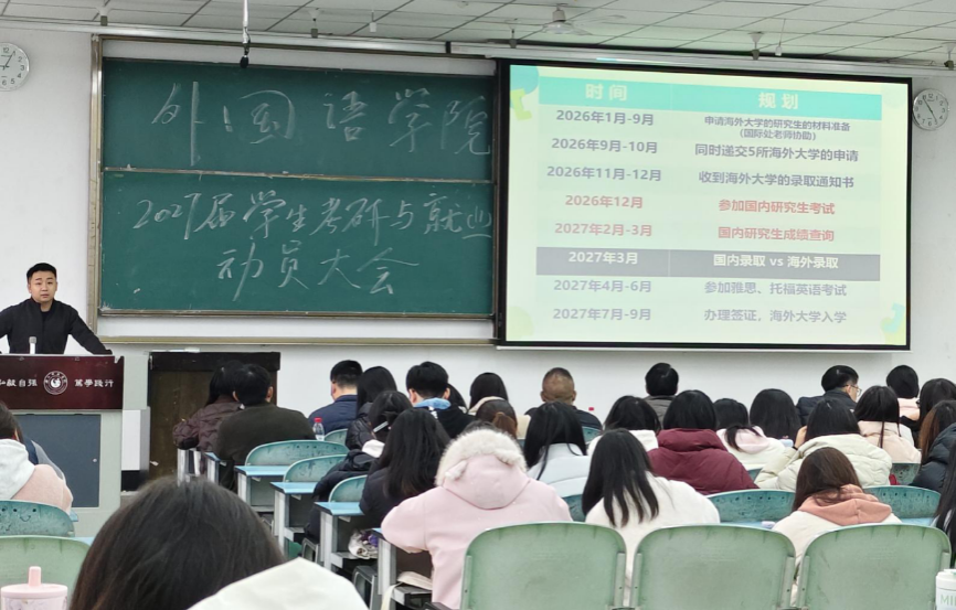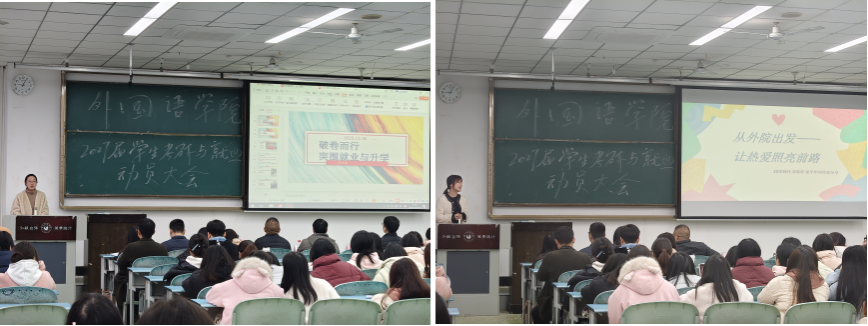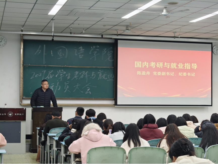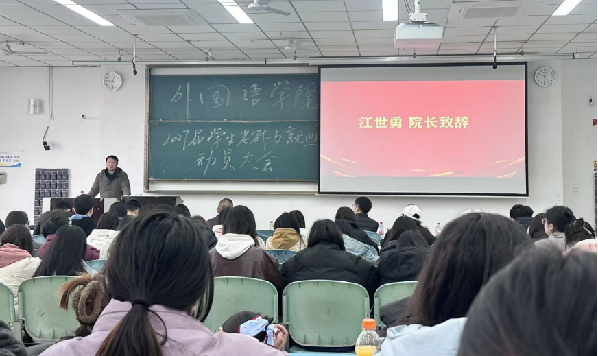 本网讯(文/王旺兵 图/贾如海)12月18日,外国语学院于行知楼425教室举办2027届学生考研与就业动员大会。此次大会旨在强化学生考研与就业服务,引导学生树立正确择业就业观念,助力学生提前规划、抢占先机,增强其信心。学院领导班子、各专业系部主任、国际交流与合作处老师周锋、往届考研优秀校友、班主任、辅导员以及2023级全体学生参会,会议由王旺兵主持。
