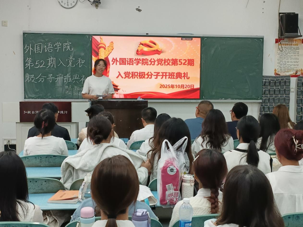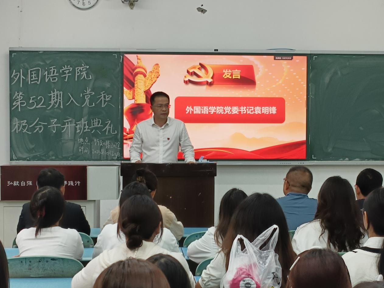 本网讯(文/曹琳、刘畅 图/张星玉、汪雨亭)为加强对入党积极分子的培养和教育,提升政治素养和理论水平,端正入党动机。10月20日,外国语学院在行知楼202教室举行了第52期入党积极分子开班典礼。外国学院党委书记袁明锋,党委副书记、纪委书记陈盈舟,专职组织员曹琳,学生党支部书记王旺兵、李振岗,新发展党员以及本期入党积极分子参加开班典礼。