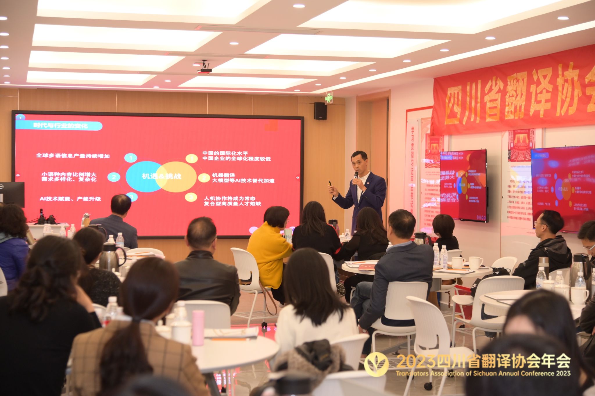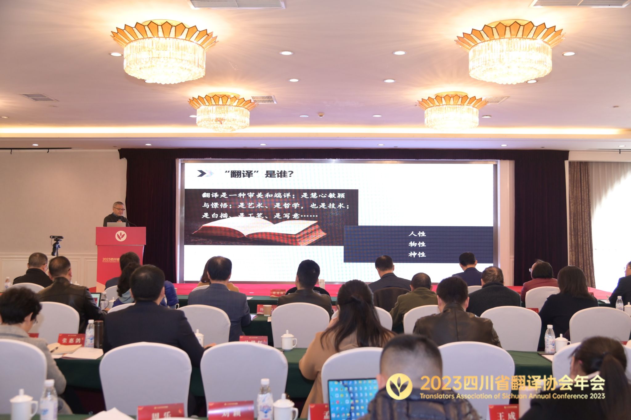 此次年会共分为三个阶段。第一阶段为理事会,四川省翻译协会会长李志民回顾了2023年理事会工作情况,分析了存在的问题并对协会相关变动做情况说明。王林就省译协入驻外国语学院的旅游文化翻译研究中心工作情况作交流发言。第二阶段为大会暨颁奖仪式。李志民作年度工作报告,回顾了2023年协会亮点工作,并指出了存在的问题。大会宣布了天府翻译精英奖、天府翻译奖、科技翻译成果奖、协会优秀工作者的获奖情况和产教研融合发展研究课题的结项情况。王林被评为2023年度协会优秀工作者。第三阶段为专家报告与分组发言。西南交通大学傅勇林教授作了题为“百年未有之大变局:现代译介何为”的主旨发言,既新解了翻译的定义与角色,又剖析了当下翻译工作者应有的担当与责任。随后,科技翻译工作委员会和学术与交流工作委员会共组织了八场分组发言,涵盖文学翻译、科技翻译、翻译技术、翻译教学、语言服务与行业发展等,让与会者受益匪浅,享受翻译研究、翻译实践、翻译教学和翻译行业的饕鬄盛宴。