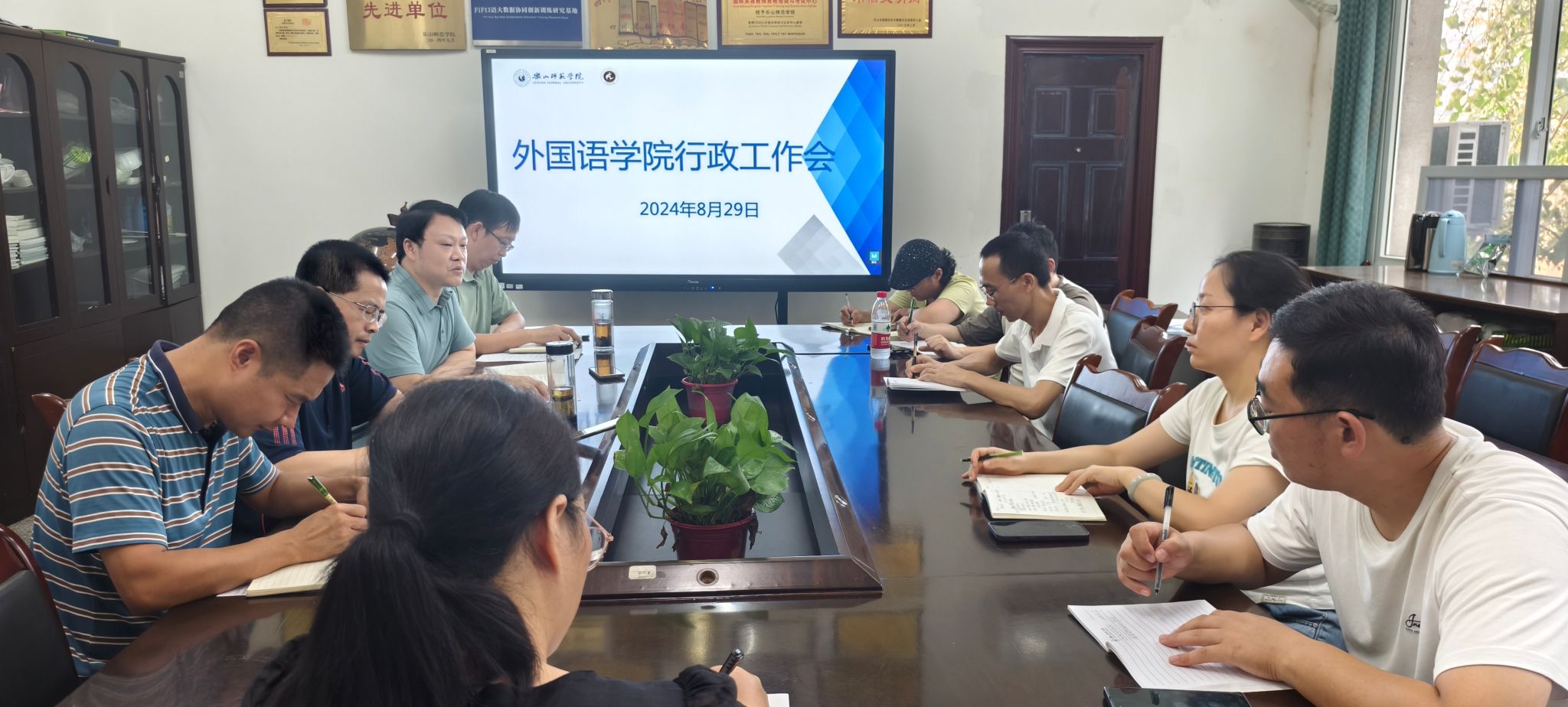 本网讯(文/唐爱苹 图/雷洪敏)8月29日外国语学院在304会议室召开新学期第一次行政工作会。会议由学院院长江世勇主持,学院党委书记袁明锋及全体行政人员参加了会议。