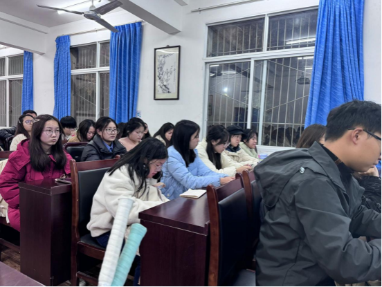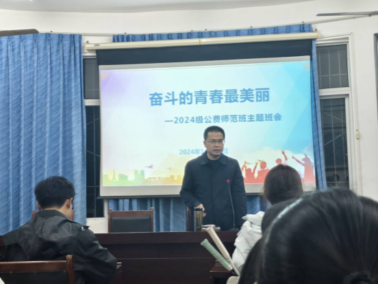 本网讯(文/陶爽 图/岳小溪)11月28日晚,外国语学院在院办101举行了以“奋斗的青春最美丽”为主题的班会活动。此次班会由外国语学院党委书记、2024级英本4班公费师范班班主任袁明锋主讲,旨在激励公费师生珍惜青春时光,努力奋斗,为教育事业贡献自己的力量。