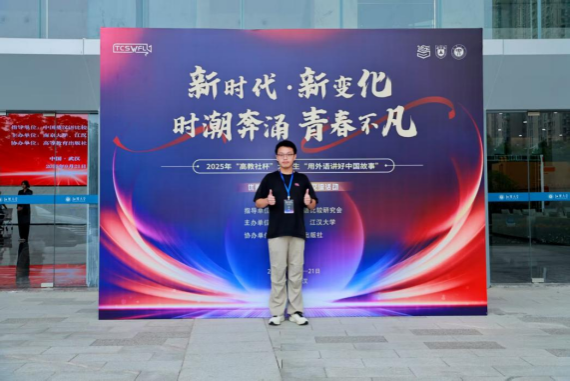 本网讯(文、图/敬金秀)9月19日至21日,2025年“高教社杯”大学生“用外语讲好中国故事”优秀短视频现场交流活动在江汉大学举办。共有全国29个省、市、自治区的1093所高等学校及职业院校的大学生,通过活动官方网站提交短视频作品6915件。经过为期9个月的初赛、复赛评选,最终120份作品进入现场交流环节角逐,其中本科院校81件作品,职业院校39件作品。我校外国语学院学生李奕佳、王浩团队在敬金秀副教授的指导下提交的作品《穿越千年的墨迹,年画的数字重生》获得全国一等奖,敬金秀获得优秀指导奖。