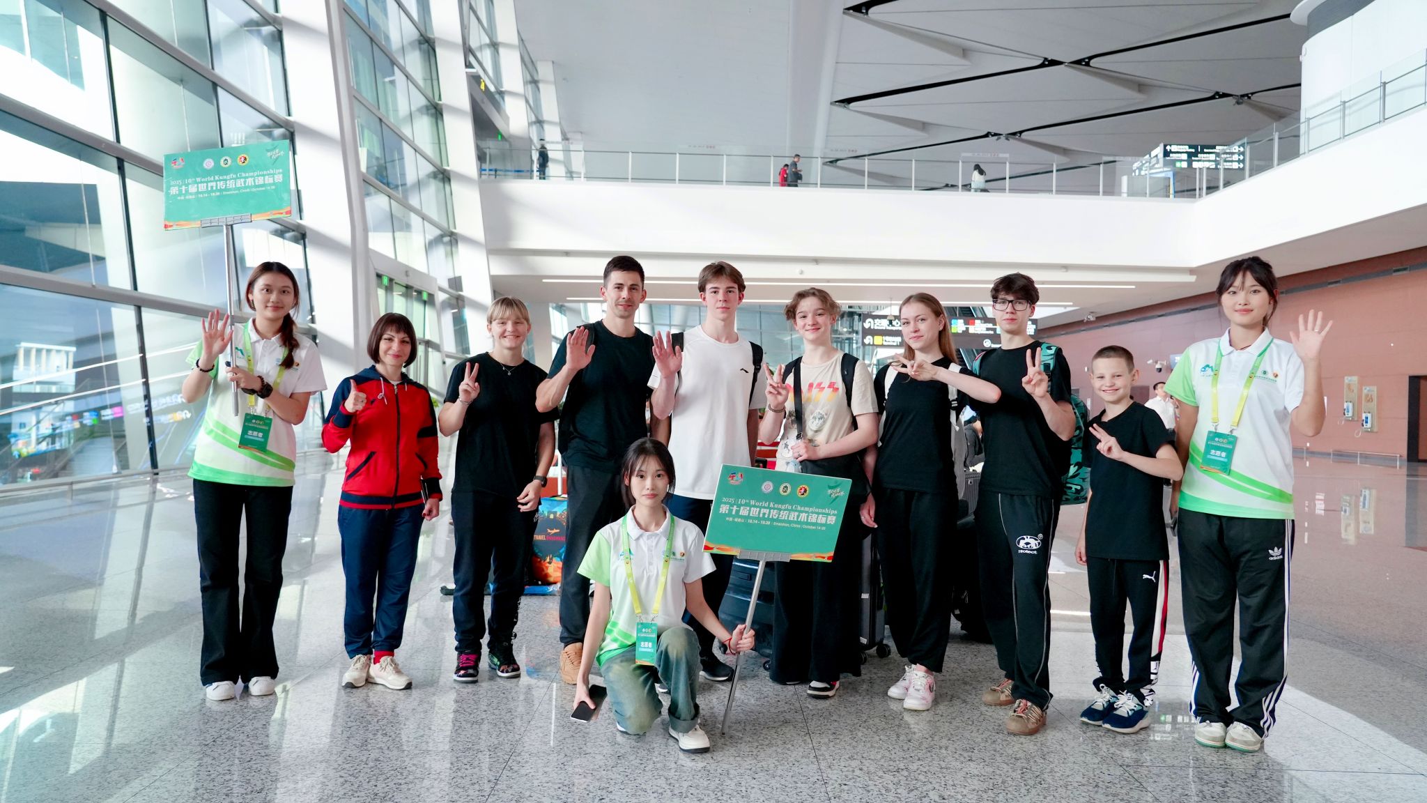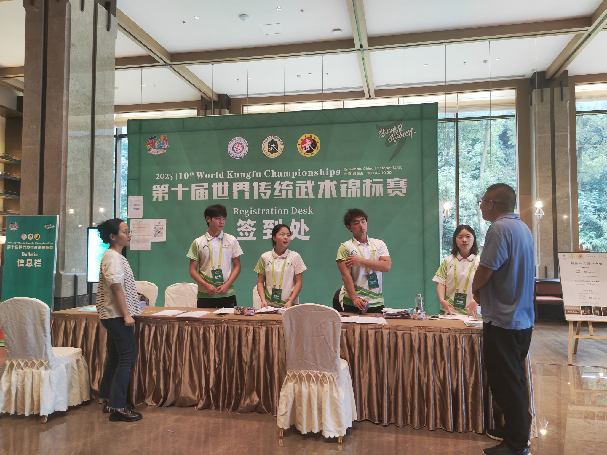 本网讯(文、图/李振岗)近日,备受瞩目的第十届世界传统武术锦标赛在峨眉山市隆重举行。作为本次赛事志愿服务工作的重要参与力量,外国语学院精心选拔并派出了一支由72名具体良好外语交流能力的志愿者队伍,他们以饱满的热情、专业的素养活跃在赛事引导、语言服务、后勤保障等各个岗位,成为赛场外一道亮丽的风景线。10月15日,外国语学院党委副书记陈盈舟、学生工作办公室副主任曹琳、2022级辅导员李振岗一行前往赛事现场,看望正在忙碌的志愿者们。
