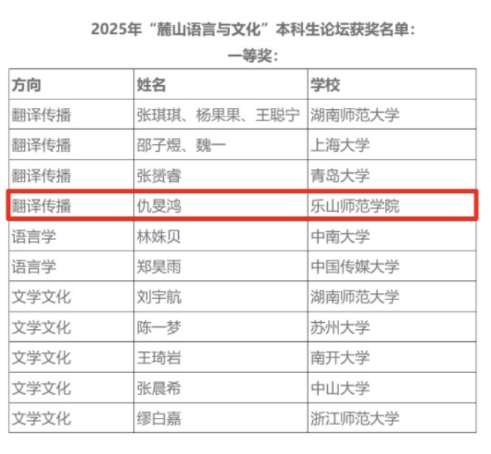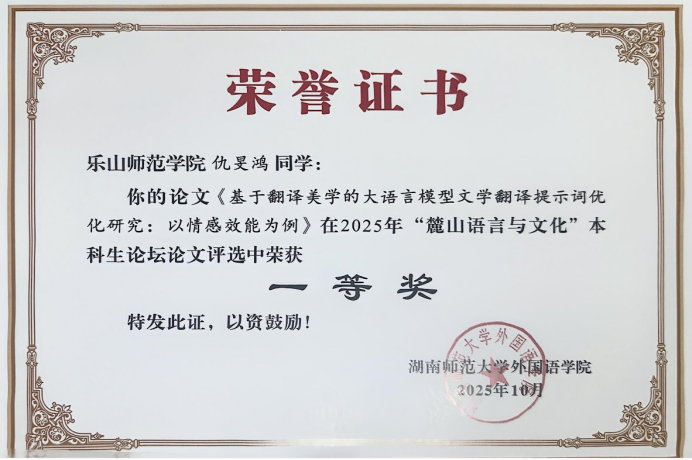本网讯(文/图 仇旻鸿)10月25日,2025年湖南师范大学“麓山语言与文化”本科生论坛在湖南师范大学外国语学院举行。我校外国语学院翻译专业2022级学生仇旻鸿在导师王林副教授的指导下,撰写论文并投稿,获得翻译传播方向议题一等奖,并受邀参加论坛宣读成果。
