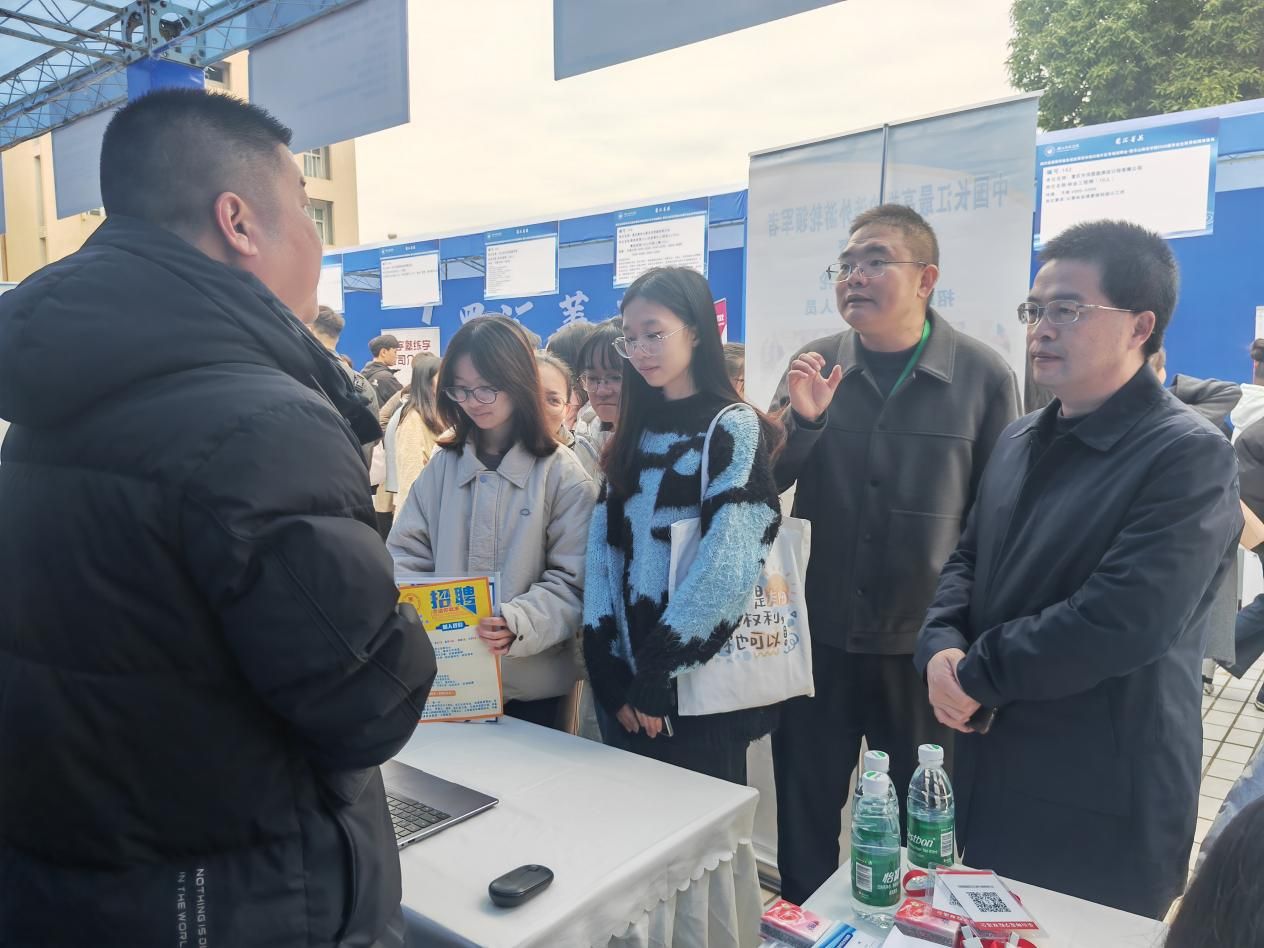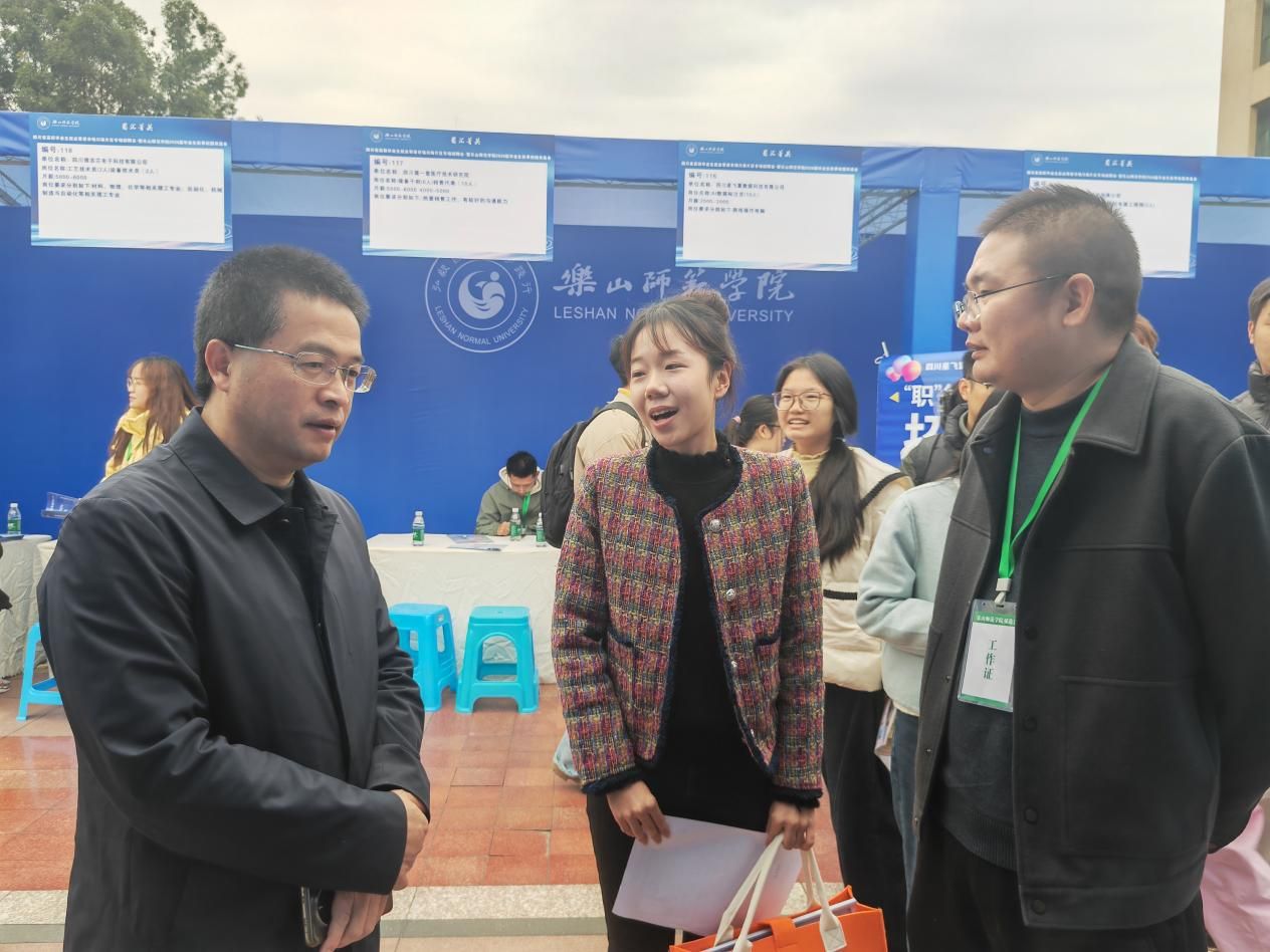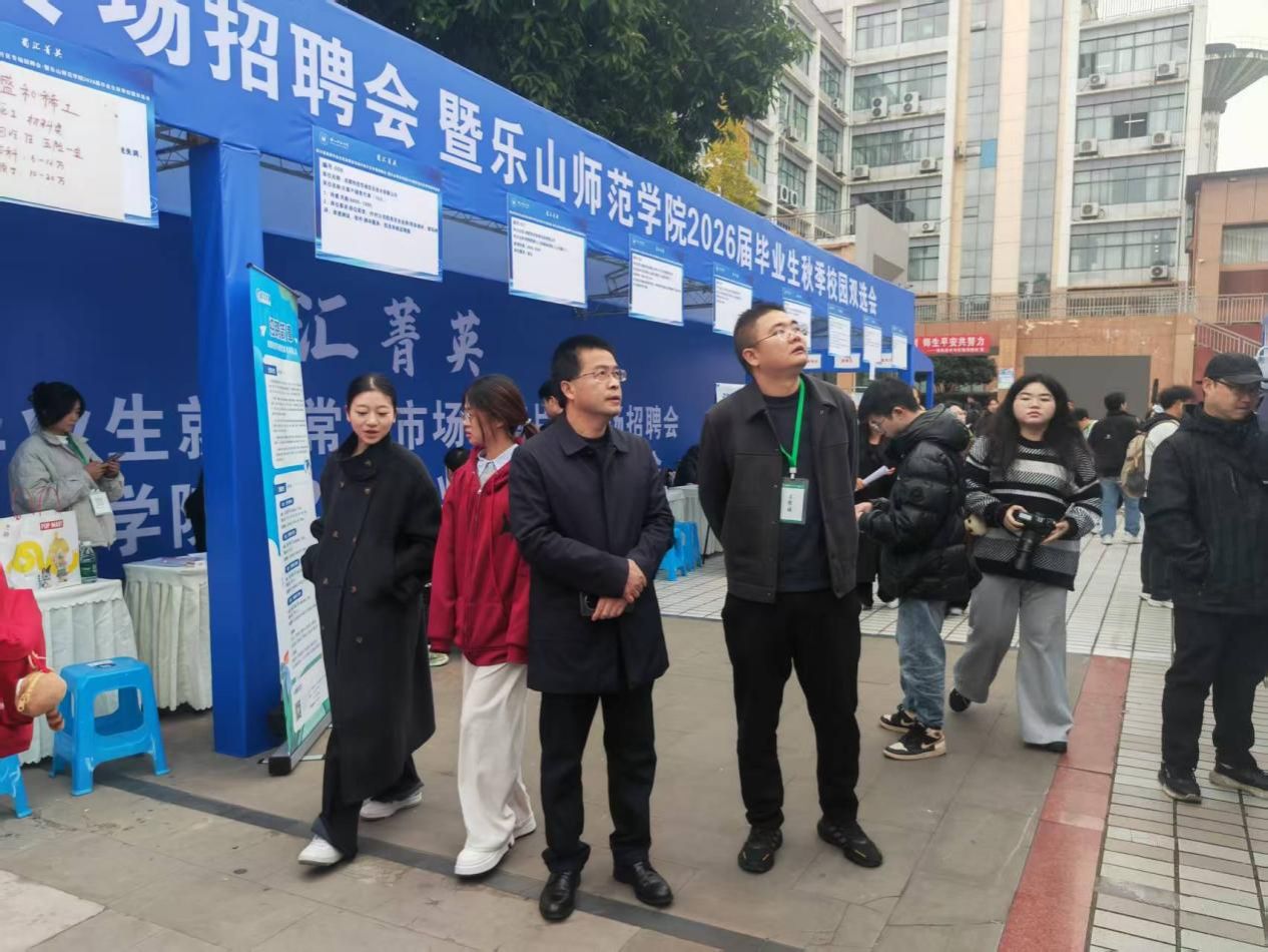 本网讯(文、图/李振岗)11月21日,乐山师范学院北校区桂花广场热闹非凡,“蜀汇箐英”四川省高校毕业生就业常设市场川南片区专场招聘会暨乐山师范学院2026届毕业生秋季校园双选会在此举行。外国语学院党委书记袁明锋,党委副书记、纪委书记陈盈舟以及2026届辅导员李振岗组成走访团队,深入双选会现场。