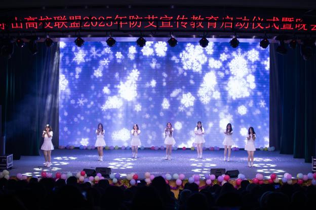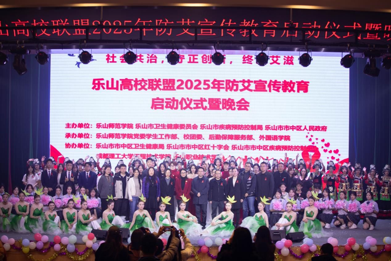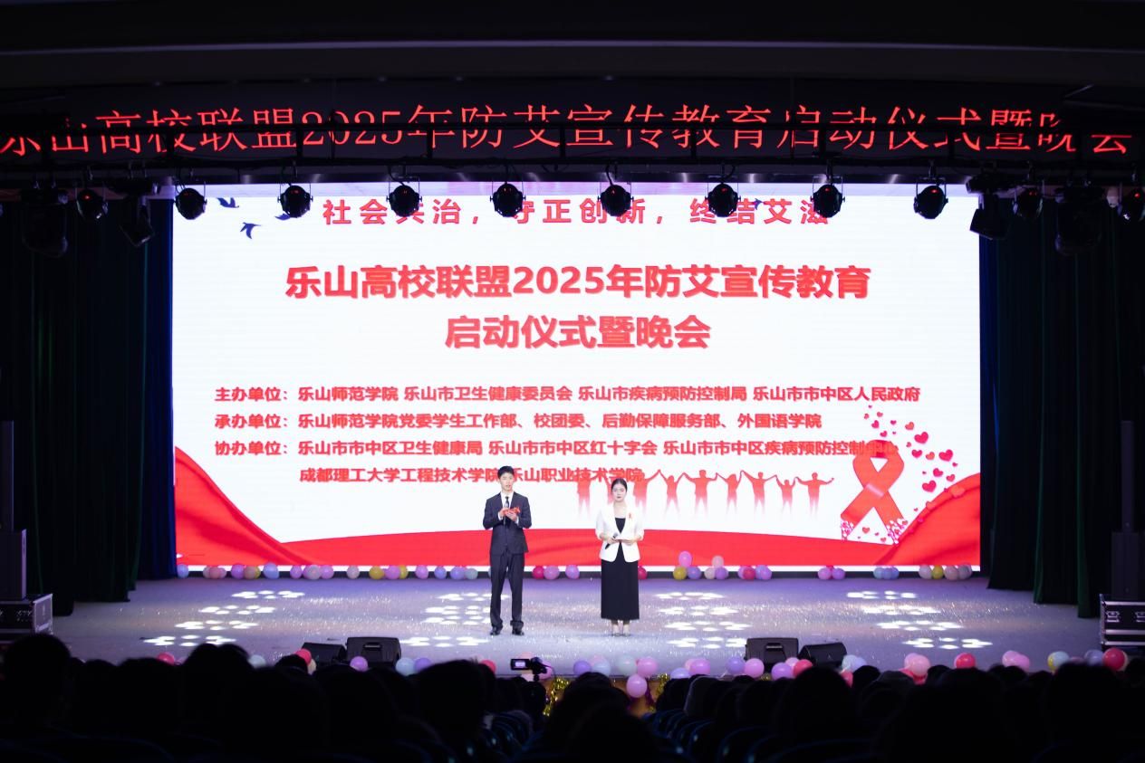 本网讯(文、图/胡玲、许桂林)11月30日晚,以“社会共治,守正创新,终结艾滋”为主题的乐山高校联盟2025年防艾宣传教育启动仪式暨晚会,在乐山师范学院多功能厅顺利举行。本次活动由乐山师范学院联合乐山市卫生健康委员会等多部门主办,外国语学院承办,乐山多所高校共同参与,旨在强化大学生防艾意识,凝聚青春力量共抗艾滋。