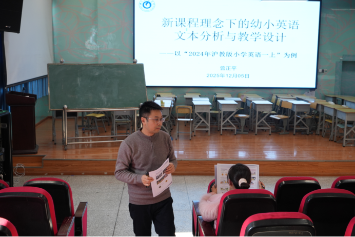 曾正平副教授以《新课程理念下的幼小英语文本分析与教学设计》为题开启授课。他先与参训教师共同梳理教学设计“教学目标设定、学情分析、活动设计、评价方式”四大核心维度逻辑,再深入剖析教材文本语言逻辑、文化内涵及教学重难点,结合幼儿认知特点详解“课时分配、难点突破、差异化教学”等实操要点,助力教师掌握“文本解读到课堂落地”的完整教学链路。