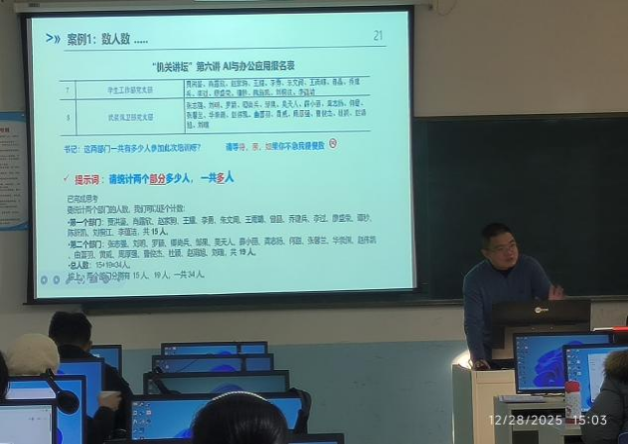 本网讯(文/程渝洁、陈盈舟 图/程渝洁)为提高马边彝族自治县中小学生教师AI赋能教学、学生管理的综合技能,12月28日,在实训楼308开展AI课堂教学、办公应用专题讲座与实践。讲座由外国语学院党委副书记陈盈舟主讲,聚焦AI赋能民族地区青少年思想政治教育落地核心主题,围绕AI在办公、教学场景的实操应用,以及信息安全与脱敏规范两大板块展开深度讲解,为在场马边中小学教师带来一场兼具实用性与指导性的技术分享。
