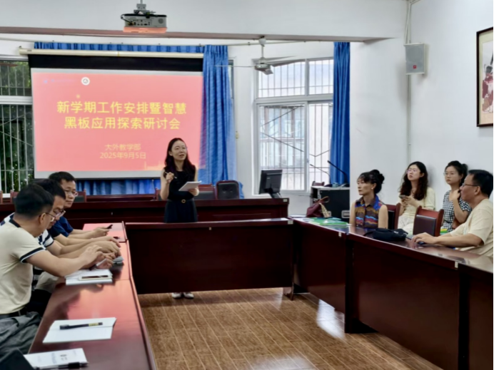 本网讯(文、图/周廷祥、姚翠平)9月5日下午,大学外语教学部在学院底楼会议室101召开新学期工作安排暨智慧黑板应用探索研讨会。大学外语教学部全体教师参加,会议由大学外语教学部主任谢丽莎主持。