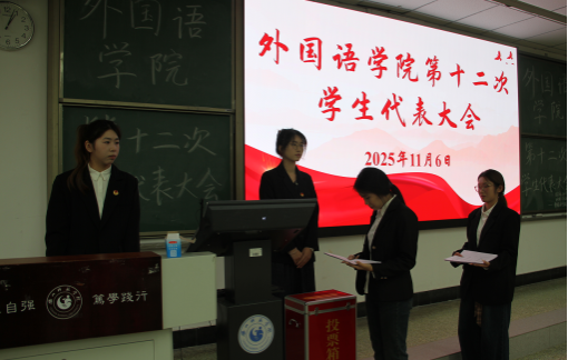 本网讯(文/高溢涵、陶爽 图/马佳薇 熊娜 谌诗颖)为总结过去一年工作成果,选举新一届学生组织机构干部,规划未来发展蓝图。11月6日,外国语学院第十二次学生代表大会于行知楼125教室隆重举行。外国语学院党委书记袁明锋,党委副书记、纪委书记陈盈舟,分团委副书记曹琳,各年级辅导员老师及全体学生代表共同参会。大会在庄严的国歌声中开幕,各项议程有序推进,圆满完成既定任务。
