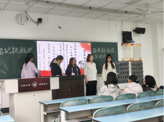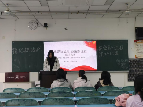 本网讯(文/周雨虹 图/李敏宇)为厚植家国情怀,传承红色基因,11月4日,外国语学院分团委综合部组织的“铭记抗战史,奋进新征程”主题宣讲比赛初赛在行知楼202教室成功举行。本次比赛由王韵寒同学主持,学院分团委综合部部长王雪莉,副部长彭维娇和余诗翼担任评委。外国语学院日语专业的同学们齐聚现场,共同参与了这场主题宣讲比赛。