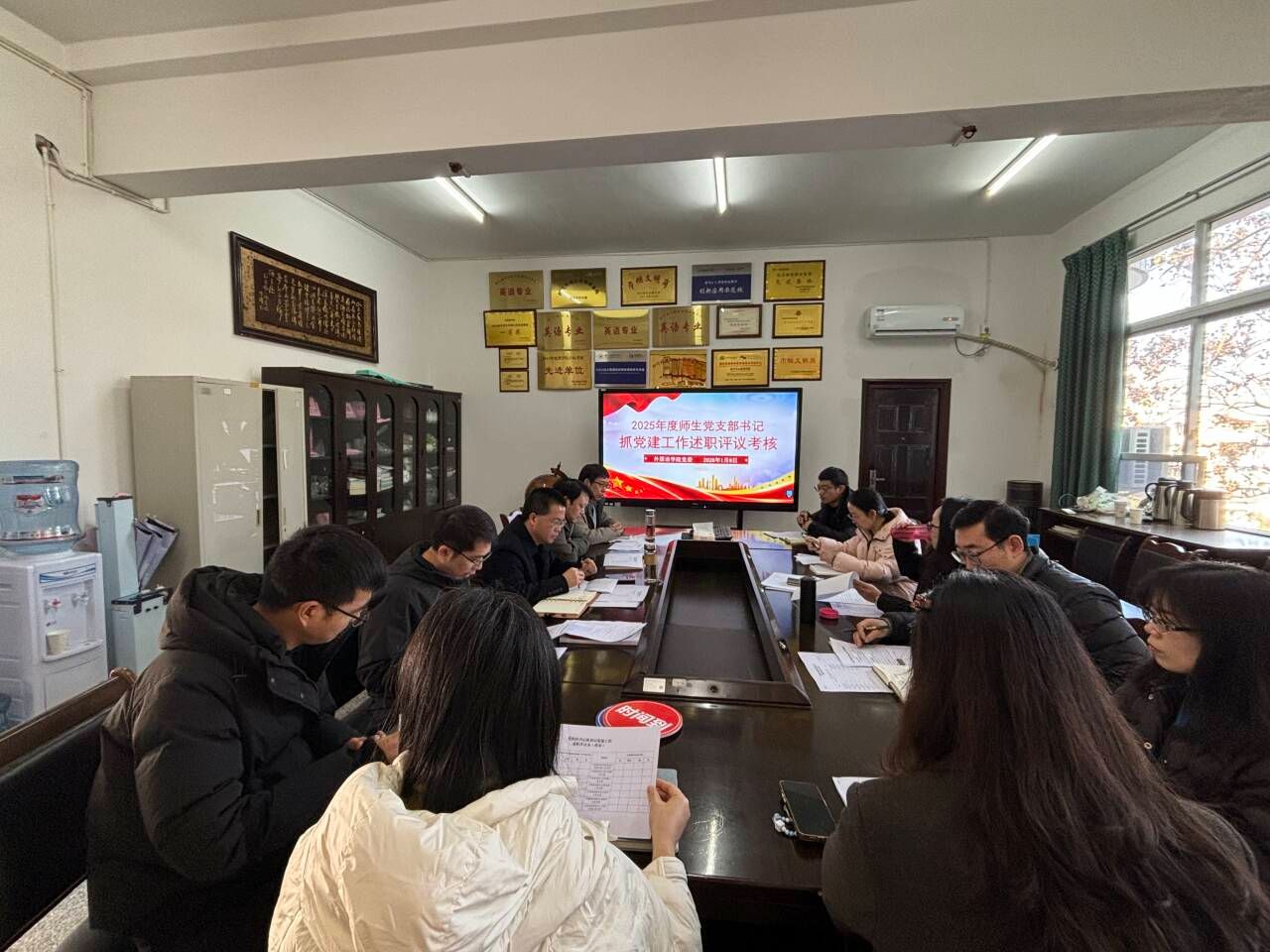 本网讯(文、图/曹琳)为全面总结过去一年党建工作,深入查摆问题,明确新一年党建工作方向,1月8日下午,外国语学院于304会议室召开了师生党支部书记抓党建工作述职评议考核大会。学院全体党委委员、师生党支部书记参加,新能源与材料化学学院专职组织员闫胜利列席指导,会议由学院党委书记袁明锋主持。