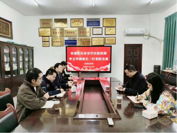 本网讯(文、图/胡蝶)11月10日,乐山市市中区组织部副部长、编办主任李文华一行莅临外国语学院,就市中区与外国语学院开展语言服务合作进行了深入交流。外国语学院党委书记袁明锋、院长江世勇、副院长陈开富、副院长王林等参加了本次会议。