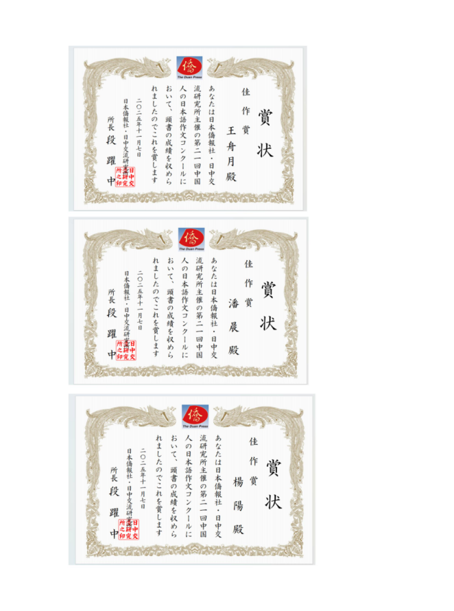 11月7日,第21届中国人日语作文大赛结果揭晓。外国语学院2022级日语专业学生王舟月、2023级日语专业学生杨阳、潘晨荣获佳作奖。至此,我校已连续十四年在该赛事中获奖。本届大赛以“「推し活」と日中交流”为主题,共设特等奖、一等奖、二等奖、三等奖及佳作奖五类奖项。自2025年5月启动征稿以来,共收到来自全国28个省、自治区、直辖市近2400篇作品。经严格评审及国际电话口试,最终评选出获奖作品。