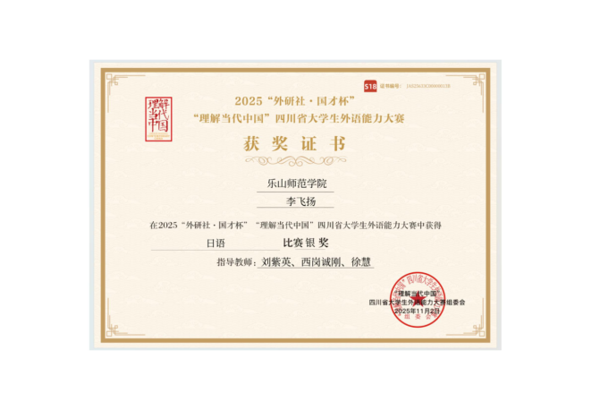 11月2日,2025年“外研社·国才杯”“理解当代中国”四川省大学生外语能力大赛在成都理工大学落幕。外国语学院2023级日语专业学生李飞扬凭借出色表现,荣获日语赛项银奖。该赛事是外语类权威赛事之一,连续多年入选“全国普通高校大学生竞赛排行榜”。本届大赛以“理解中国,沟通世界”为主题,旨在深化“三进”工作、创新课程思政,并助力提升我国国际传播能力。