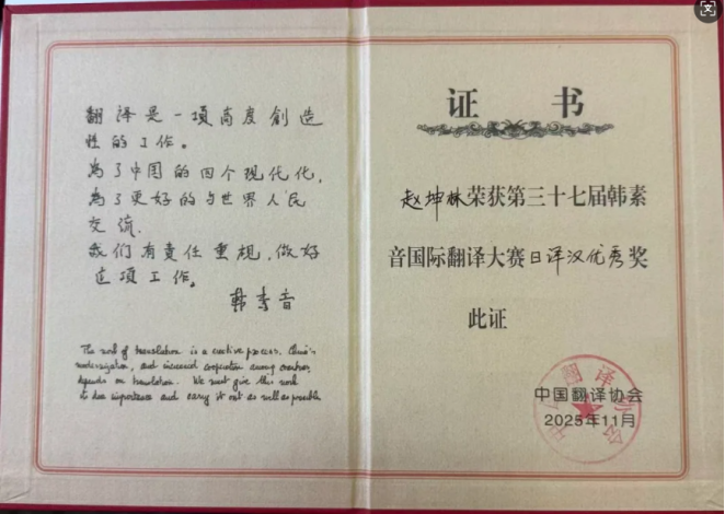 近日,第37届韩素音国际翻译大赛获奖名单正式公布。外国语学院2023级日语专业学生赵坤林荣获日译汉优秀奖,系日语专业学生首次参赛即获殊荣。该大赛由中国翻译协会等机构联合主办,涵盖汉语与英语、日语等10个语种的双向互译项目,共收到参赛译文近22000份,是国内级别最高、历史最悠久的翻译赛事之一。